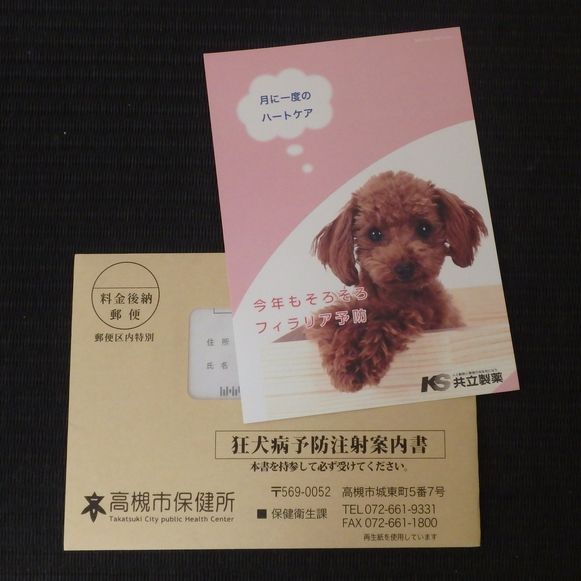 病院からはフィラリアの予防接種のお知らせと、保健所からの狂犬病の予防接種の案内書